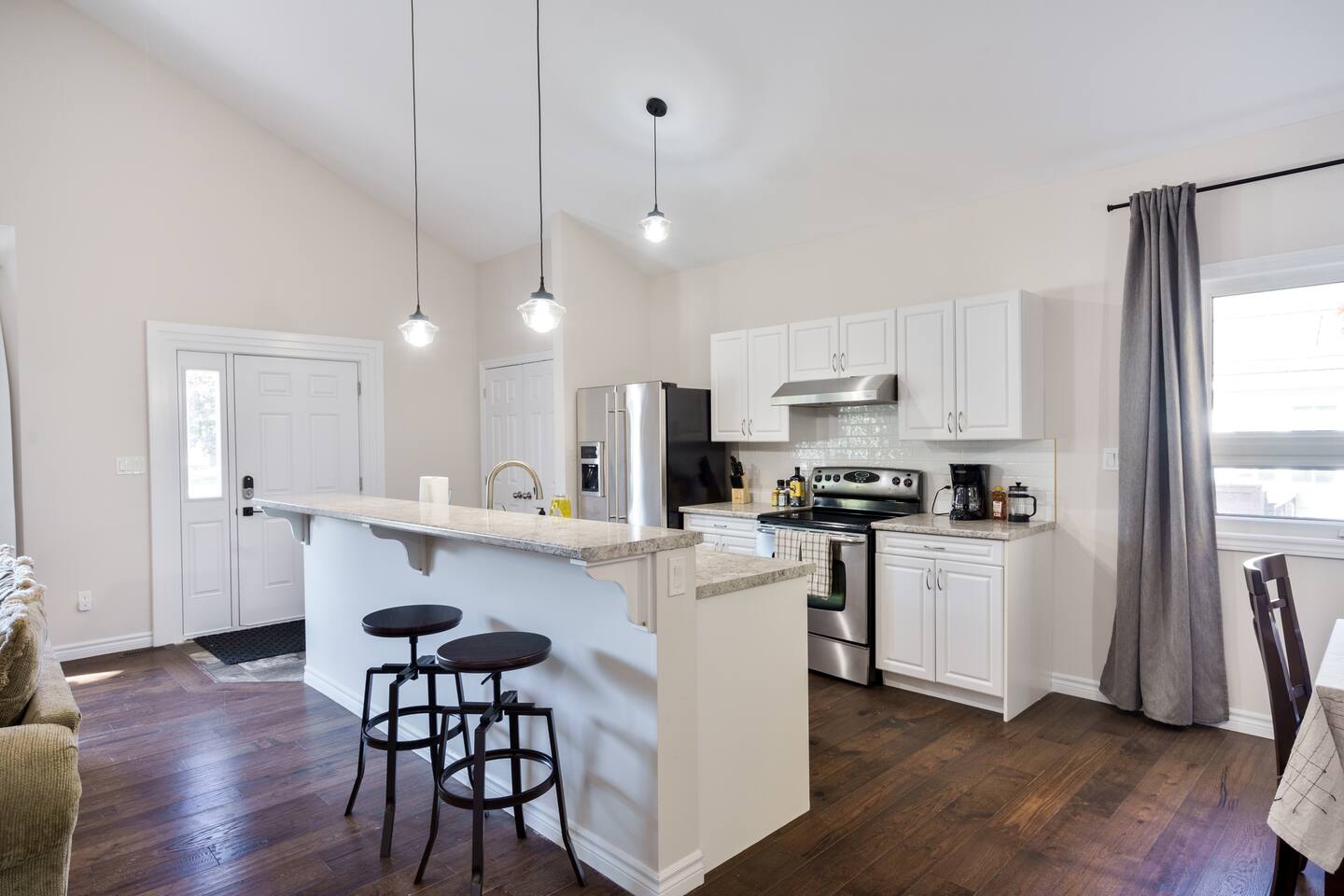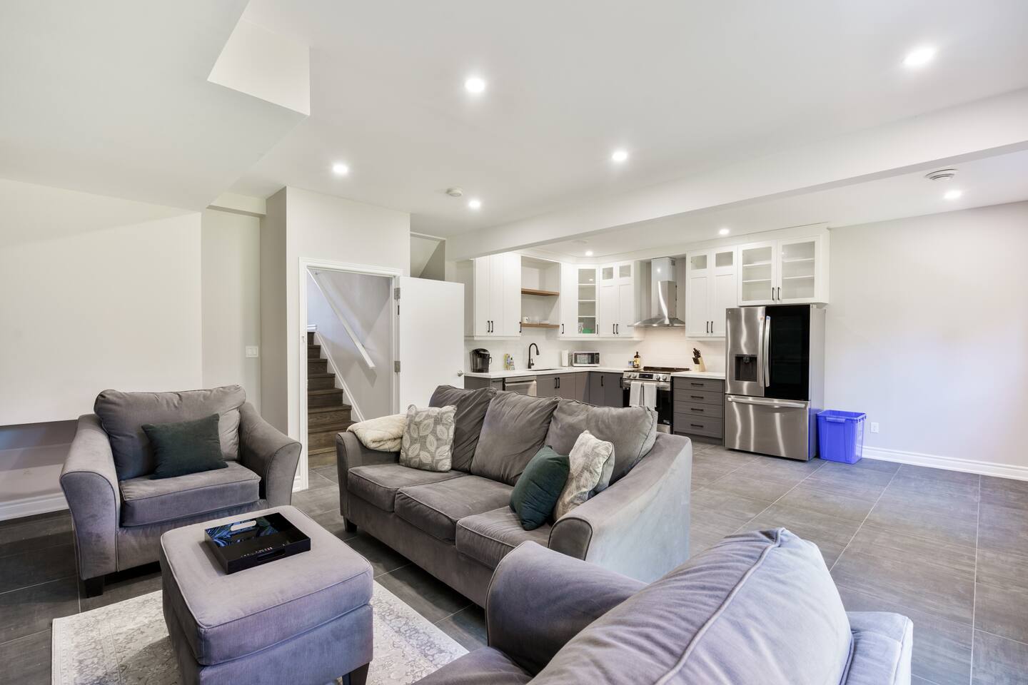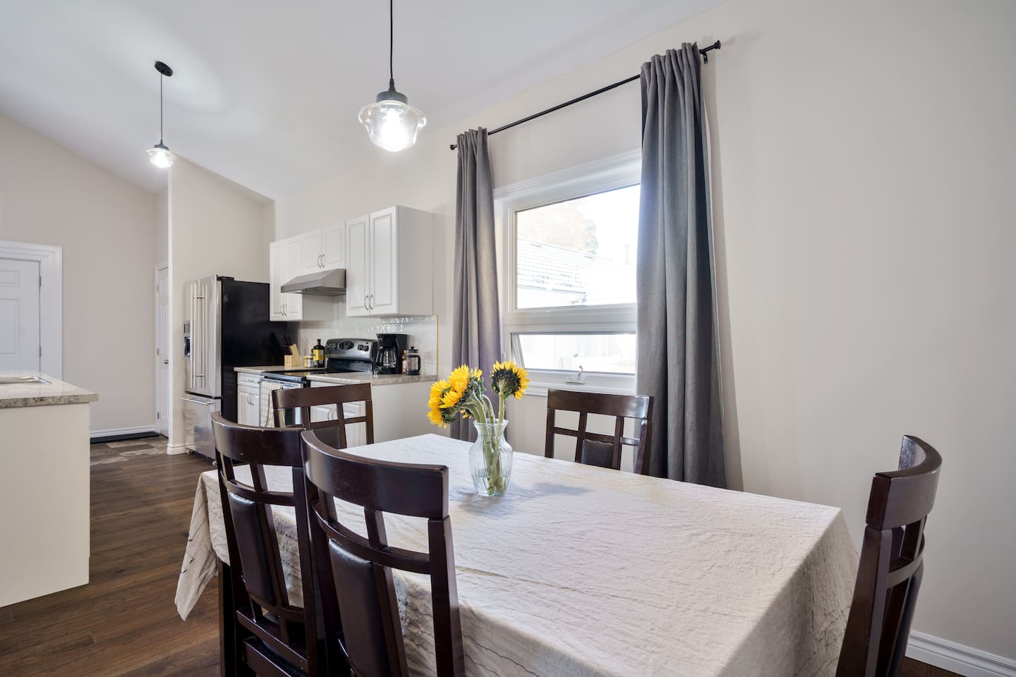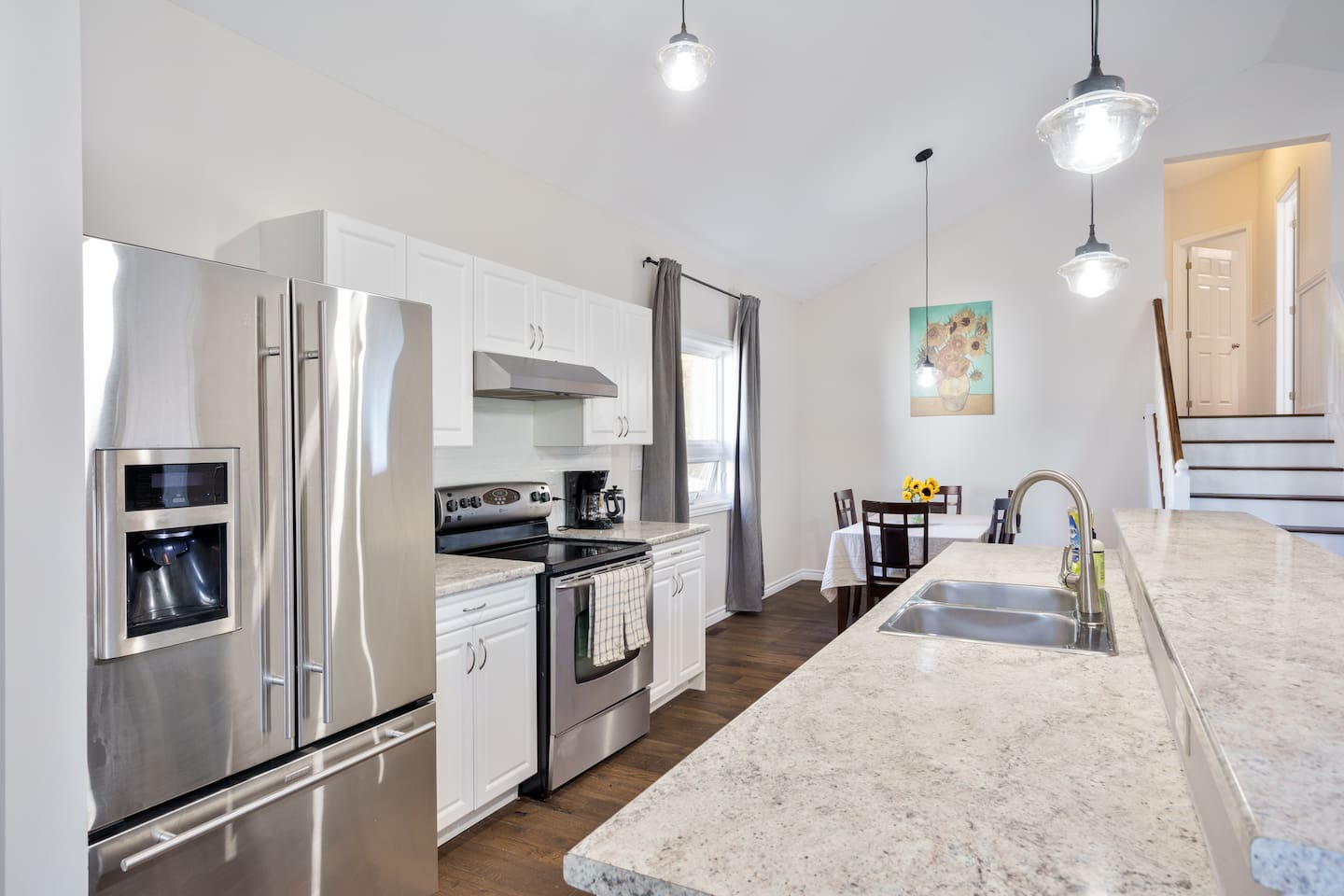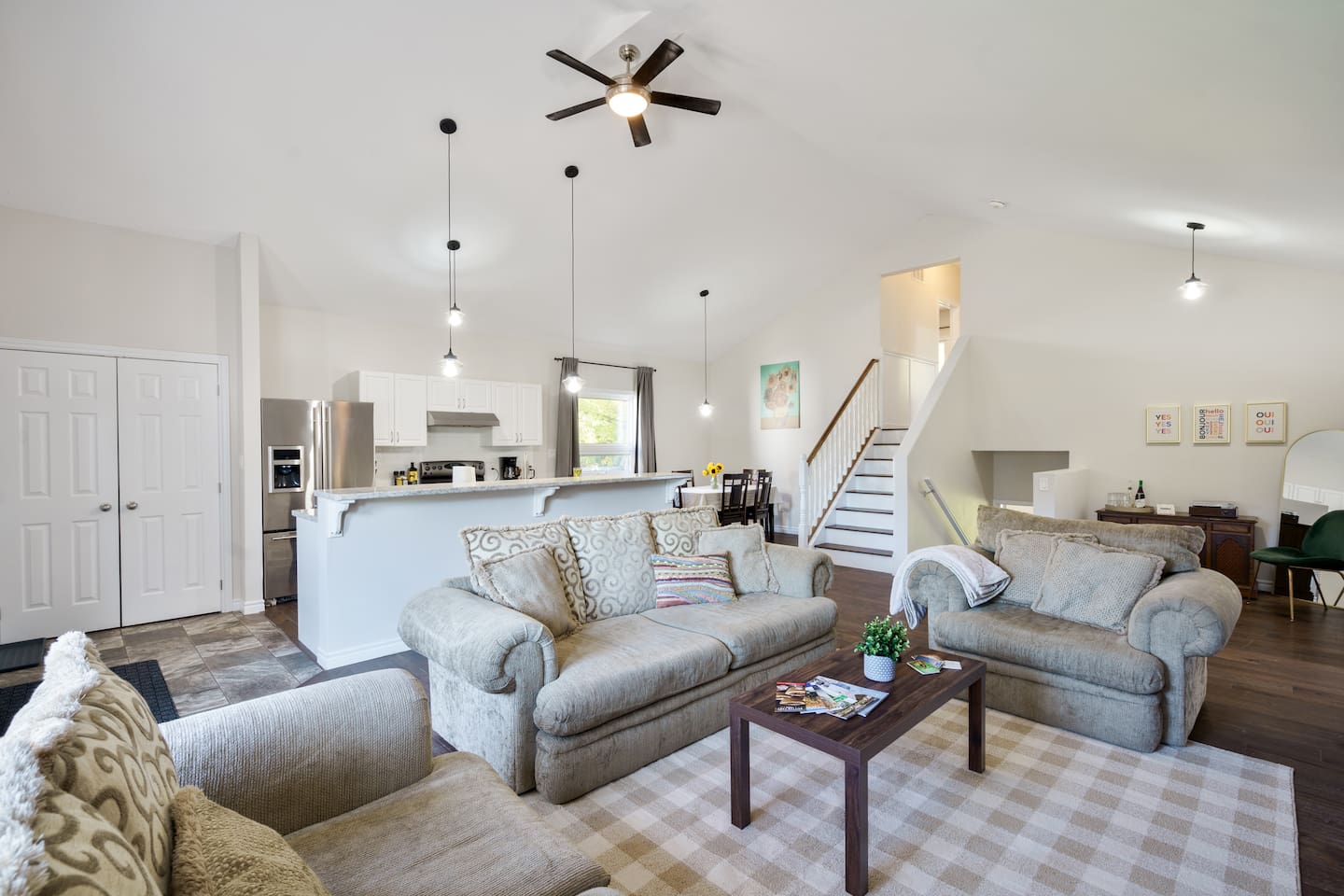 This unique 4-floor home provides ample room for your group to relax and connect, featuring 4 bedrooms and 2 full bathrooms for up to 8 guests. **Main Living Area (Upper Level)**: An open-concept space with comfortable couches, a large Smart TV, and a Bluetooth record player. **Kitchen & Dining (Upper Level)**: A fully equipped kitchen with coffee, tea, and spices. A large island and a dining table for six make group meals easy. **Downstairs Living Area**: A second cozy living room with its own Smart TV and a sliding door leading to the backyard. **Downstairs Kitchen**: A convenient second full kitchen complete with a dishwasher, Keurig machine, microwave, and cooking essentials. **Bedrooms**: * Master Bedroom (Top Floor): Queen bed, large walk-in closet, and a dedicated workspace. * Second Bedroom (Top Floor): Queen bed, closet, and a full-length mirror. * Third Bedroom (Bottom Floor): Queen bed and a closet. * Fourth Bedroom (Bottom Floor): Queen bed and a closet. **Bathrooms**: Two full bathrooms (one on the top floor, one on the bottom), each with a shower/tub combo and complimentary toiletries. **Outdoor Spaces**: Enjoy a private patio with Muskoka chairs and an expansive backyard with a BBQ grill and outdoor dining area. **Extra Amenities**: The home includes two sets of washers and dryers, fast Wi-Fi for streaming and remote work, and a magnetic dartboard for entertainment. This unique 4-floor home provides ample room for your group to relax and connect, featuring 4 bedrooms and 2 full bathrooms for up to 8 guests. **Main Living Area (Upper Level)**: An open-concept space with comfortable couches, a large Smart TV, and a Bluetooth record player. **Kitchen & Dining (Upper Level)**: A fully equipped kitchen with coffee, tea, and spices. A large island and a dining table for six make group meals easy. **Downstairs Living Area**: A second cozy living room with its own Smart TV and a sliding door leading to the backyard. **Downstairs Kitchen**: A convenient second full kitchen complete with a dishwasher, Keurig machine, microwave, and cooking essentials. **Bedrooms**: * Master Bedroom (Top Floor): Queen bed, large walk-in closet, and a dedicated workspace. * Second Bedroom (Top Floor): Queen bed, closet, and a full-length mirror. * Third Bedroom (Bottom Floor): Queen bed and a closet. * Fourth Bedroom (Bottom Floor): Queen bed and a closet. **Bathrooms**: Two full bathrooms (one on the top floor, one on the bottom), each with a shower/tub combo and complimentary toiletries. **Outdoor Spaces**: Enjoy a private patio with Muskoka chairs and an expansive backyard with a BBQ grill and outdoor dining area. **Extra Amenities**: The home includes two sets of washers and dryers, fast Wi-Fi for streaming and remote work, and a magnetic dartboard for entertainment.