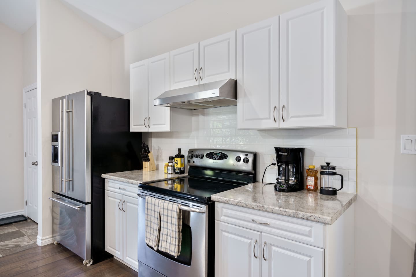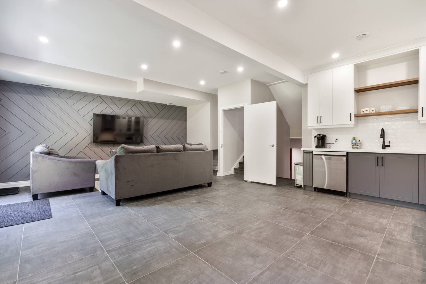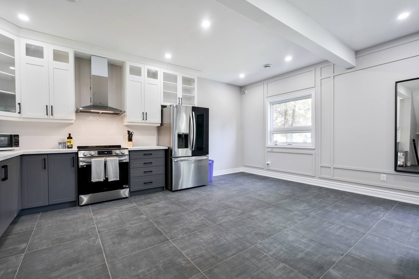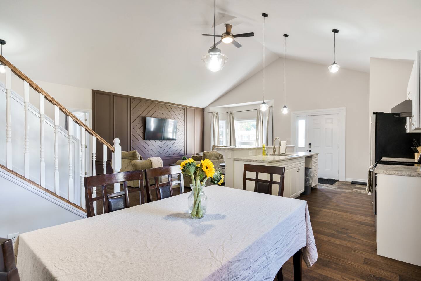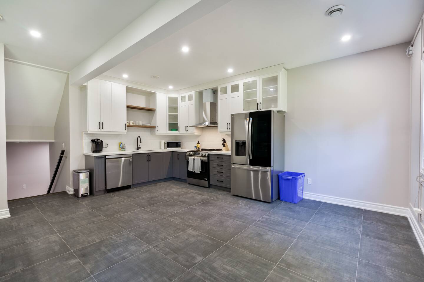 This unique 4-floor home provides ample room for your group to relax and connect, featuring 4 bedrooms and 2 full bathrooms for up to 8 guests. **Main Living Area (Upper Level)**: An open-concept space with comfortable couches, a large Smart TV, and a Bluetooth record player. **Kitchen & Dining (Upper Level)**: A fully equipped kitchen with coffee, tea, and spices. A large island and a dining table for six make group meals easy. **Downstairs Living Area**: A second cozy living room with its own Smart TV and a sliding door leading to the backyard. **Downstairs Kitchen**: A convenient second full kitchen complete with a dishwasher, Keurig machine, microwave, and cooking essentials. **Bedrooms**: * Master Bedroom (Top Floor): Queen bed, large walk-in closet, and a dedicated workspace. * Second Bedroom (Top Floor): Queen bed, closet, and a full-length mirror. * Third Bedroom (Bottom Floor): Queen bed and a closet. * Fourth Bedroom (Bottom Floor): Queen bed and a closet. **Bathrooms**: Two full bathrooms (one on the top floor, one on the bottom), each with a shower/tub combo and complimentary toiletries. **Outdoor Spaces**: Enjoy a private patio with Muskoka chairs and an expansive backyard with a BBQ grill and outdoor dining area. **Extra Amenities**: The home includes two sets of washers and dryers, fast Wi-Fi for streaming and remote work, and a magnetic dartboard for entertainment. This unique 4-floor home provides ample room for your group to relax and connect, featuring 4 bedrooms and 2 full bathrooms for up to 8 guests. **Main Living Area (Upper Level)**: An open-concept space with comfortable couches, a large Smart TV, and a Bluetooth record player. **Kitchen & Dining (Upper Level)**: A fully equipped kitchen with coffee, tea, and spices. A large island and a dining table for six make group meals easy. **Downstairs Living Area**: A second cozy living room with its own Smart TV and a sliding door leading to the backyard. **Downstairs Kitchen**: A convenient second full kitchen complete with a dishwasher, Keurig machine, microwave, and cooking essentials. **Bedrooms**: * Master Bedroom (Top Floor): Queen bed, large walk-in closet, and a dedicated workspace. * Second Bedroom (Top Floor): Queen bed, closet, and a full-length mirror. * Third Bedroom (Bottom Floor): Queen bed and a closet. * Fourth Bedroom (Bottom Floor): Queen bed and a closet. **Bathrooms**: Two full bathrooms (one on the top floor, one on the bottom), each with a shower/tub combo and complimentary toiletries. **Outdoor Spaces**: Enjoy a private patio with Muskoka chairs and an expansive backyard with a BBQ grill and outdoor dining area. **Extra Amenities**: The home includes two sets of washers and dryers, fast Wi-Fi for streaming and remote work, and a magnetic dartboard for entertainment.