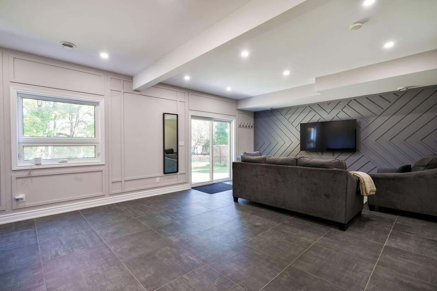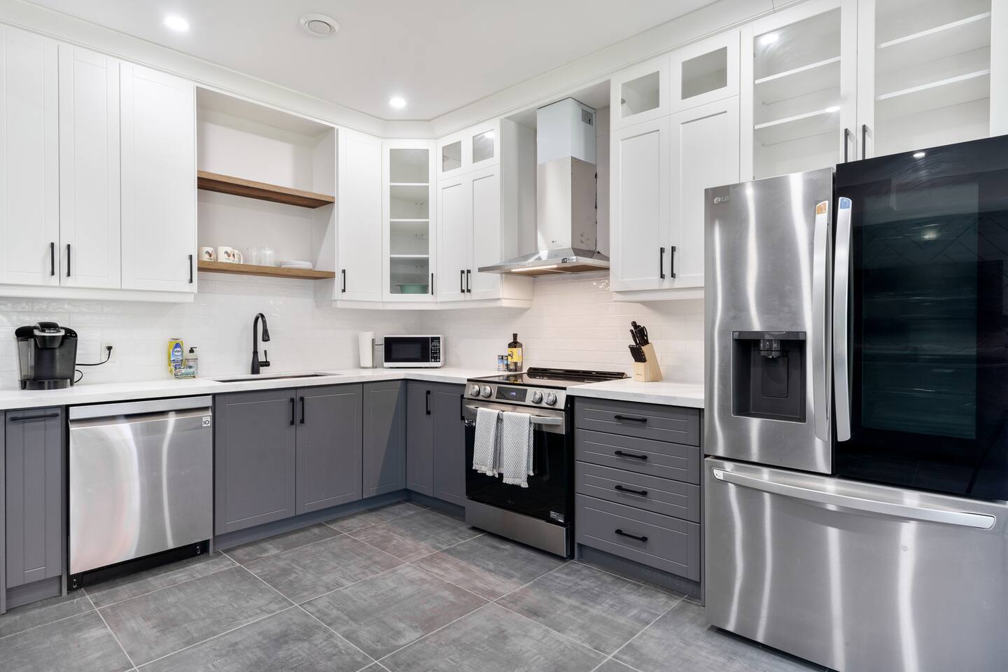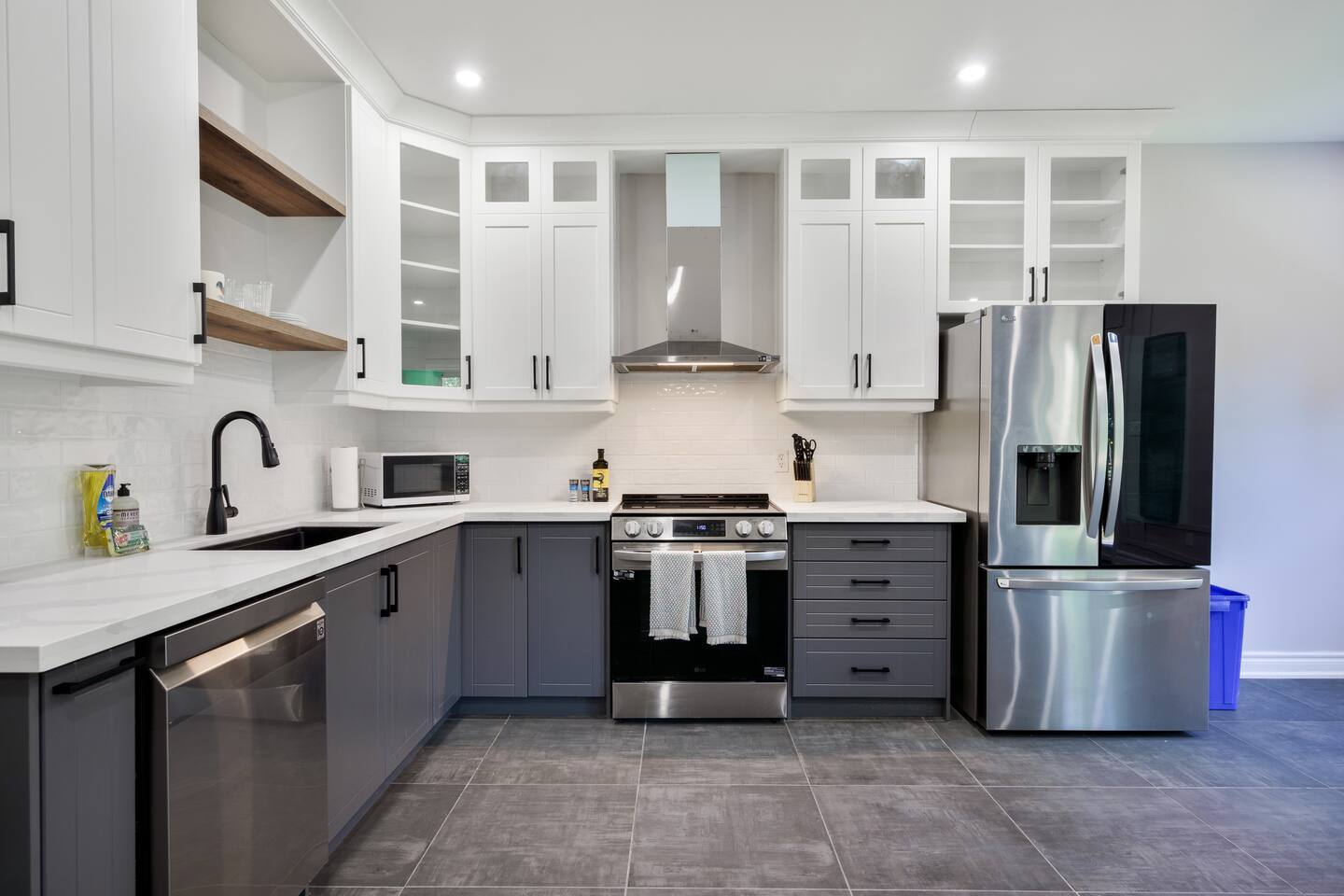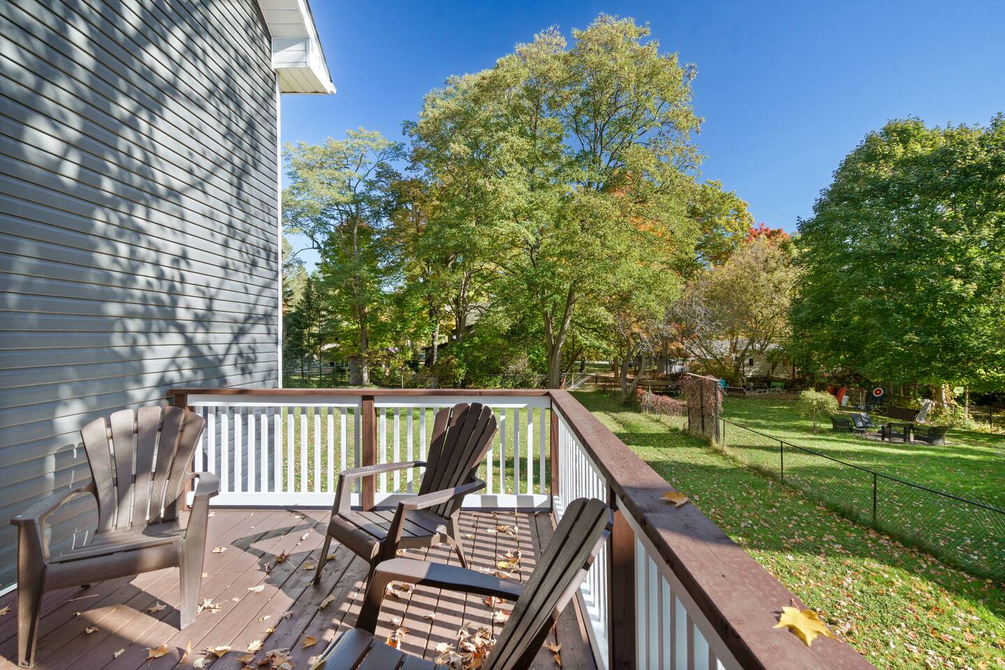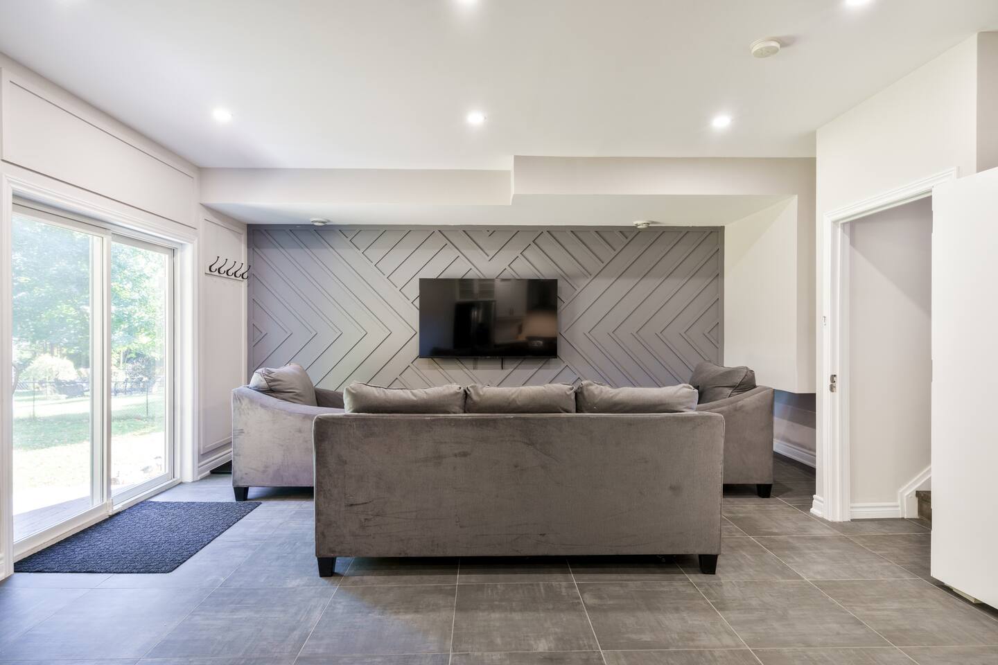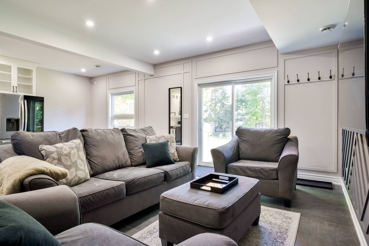 This unique 4-floor home provides ample room for your group to relax and connect, featuring 4 bedrooms and 2 full bathrooms for up to 8 guests. **Main Living Area (Upper Level)**: An open-concept space with comfortable couches, a large Smart TV, and a Bluetooth record player. **Kitchen & Dining (Upper Level)**: A fully equipped kitchen with coffee, tea, and spices. A large island and a dining table for six make group meals easy. **Downstairs Living Area**: A second cozy living room with its own Smart TV and a sliding door leading to the backyard. **Downstairs Kitchen**: A convenient second full kitchen complete with a dishwasher, Keurig machine, microwave, and cooking essentials. **Bedrooms**: * Master Bedroom (Top Floor): Queen bed, large walk-in closet, and a dedicated workspace. * Second Bedroom (Top Floor): Queen bed, closet, and a full-length mirror. * Third Bedroom (Bottom Floor): Queen bed and a closet. * Fourth Bedroom (Bottom Floor): Queen bed and a closet. **Bathrooms**: Two full bathrooms (one on the top floor, one on the bottom), each with a shower/tub combo and complimentary toiletries. **Outdoor Spaces**: Enjoy a private patio with Muskoka chairs and an expansive backyard with a BBQ grill and outdoor dining area. **Extra Amenities**: The home includes two sets of washers and dryers, fast Wi-Fi for streaming and remote work, and a magnetic dartboard for entertainment. This unique 4-floor home provides ample room for your group to relax and connect, featuring 4 bedrooms and 2 full bathrooms for up to 8 guests. **Main Living Area (Upper Level)**: An open-concept space with comfortable couches, a large Smart TV, and a Bluetooth record player. **Kitchen & Dining (Upper Level)**: A fully equipped kitchen with coffee, tea, and spices. A large island and a dining table for six make group meals easy. **Downstairs Living Area**: A second cozy living room with its own Smart TV and a sliding door leading to the backyard. **Downstairs Kitchen**: A convenient second full kitchen complete with a dishwasher, Keurig machine, microwave, and cooking essentials. **Bedrooms**: * Master Bedroom (Top Floor): Queen bed, large walk-in closet, and a dedicated workspace. * Second Bedroom (Top Floor): Queen bed, closet, and a full-length mirror. * Third Bedroom (Bottom Floor): Queen bed and a closet. * Fourth Bedroom (Bottom Floor): Queen bed and a closet. **Bathrooms**: Two full bathrooms (one on the top floor, one on the bottom), each with a shower/tub combo and complimentary toiletries. **Outdoor Spaces**: Enjoy a private patio with Muskoka chairs and an expansive backyard with a BBQ grill and outdoor dining area. **Extra Amenities**: The home includes two sets of washers and dryers, fast Wi-Fi for streaming and remote work, and a magnetic dartboard for entertainment.