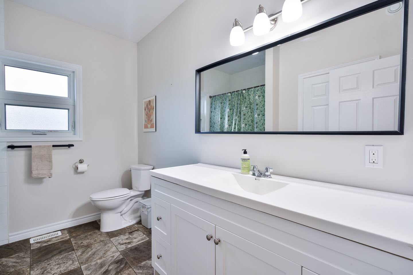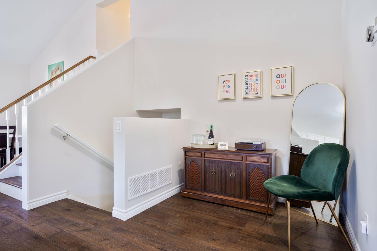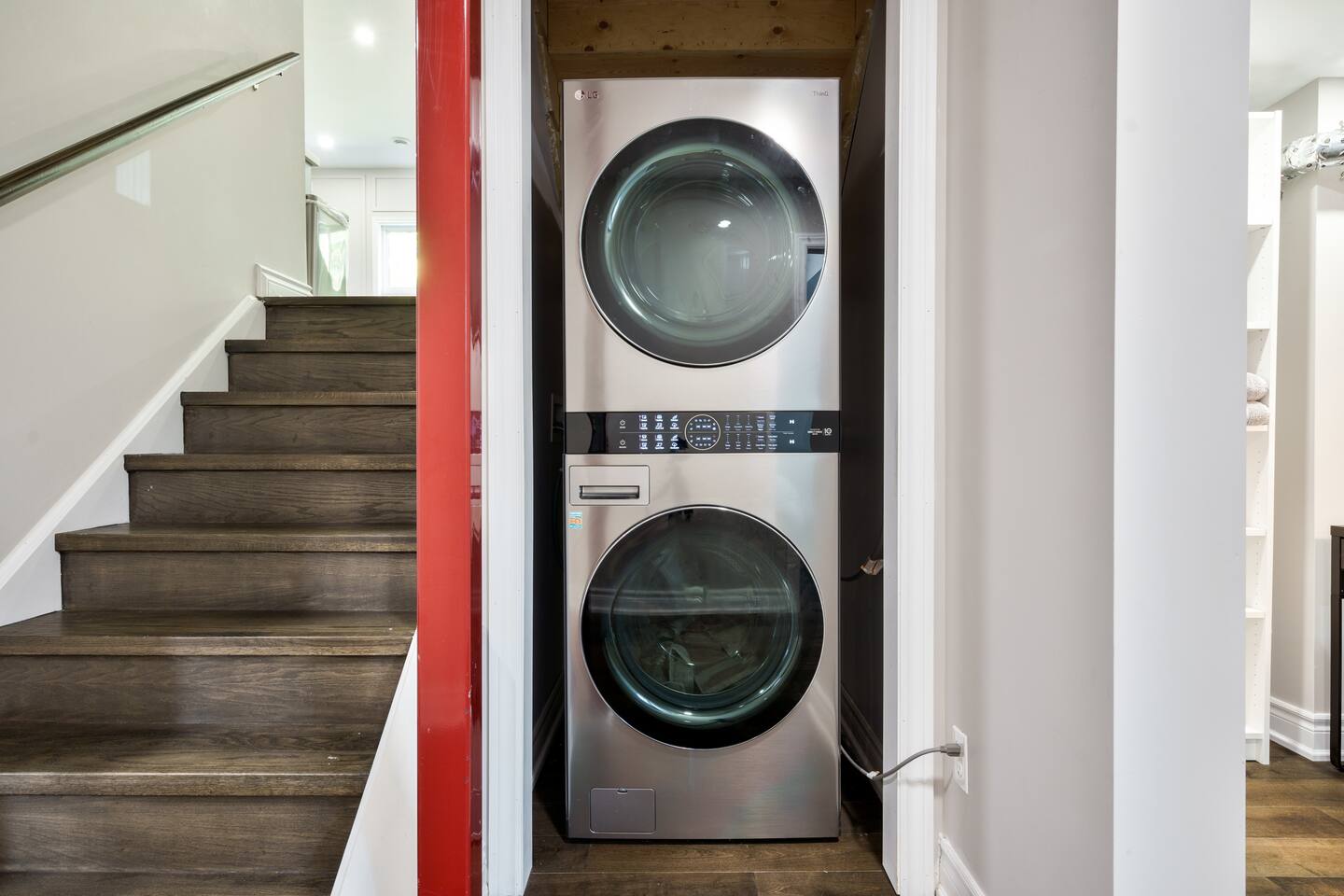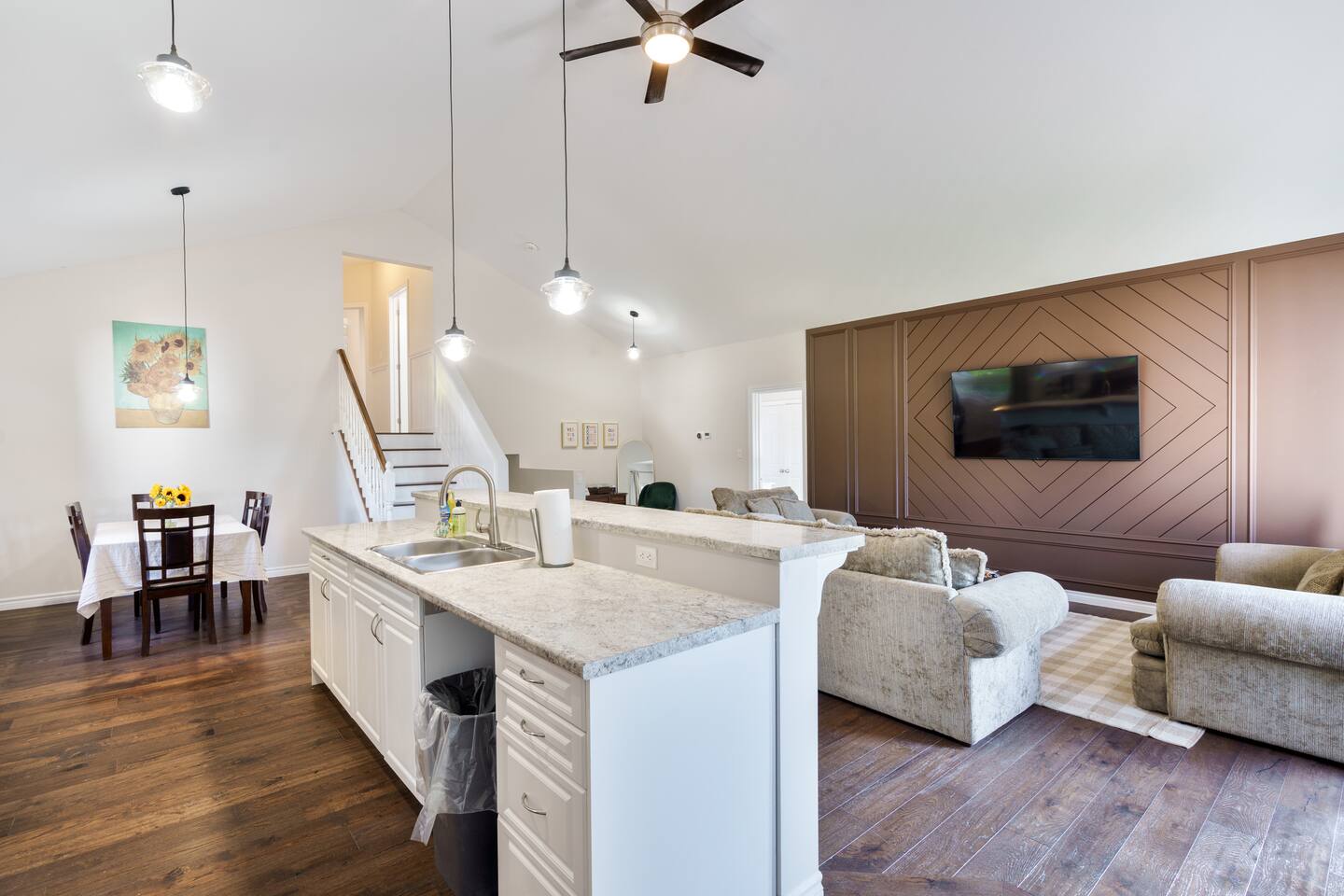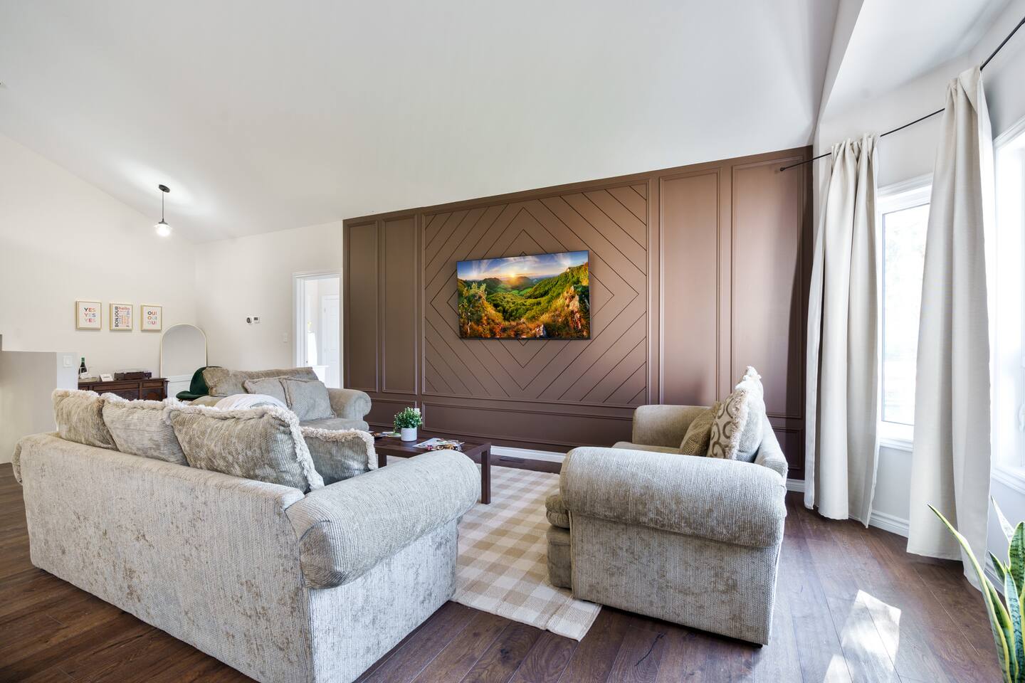 This unique 4-floor home provides ample room for your group to relax and connect, featuring 4 bedrooms and 2 full bathrooms for up to 8 guests. **Main Living Area (Upper Level)**: An open-concept space with comfortable couches, a large Smart TV, and a Bluetooth record player. **Kitchen & Dining (Upper Level)**: A fully equipped kitchen with coffee, tea, and spices. A large island and a dining table for six make group meals easy. **Downstairs Living Area**: A second cozy living room with its own Smart TV and a sliding door leading to the backyard. **Downstairs Kitchen**: A convenient second full kitchen complete with a dishwasher, Keurig machine, microwave, and cooking essentials. **Bedrooms**: * Master Bedroom (Top Floor): Queen bed, large walk-in closet, and a dedicated workspace. * Second Bedroom (Top Floor): Queen bed, closet, and a full-length mirror. * Third Bedroom (Bottom Floor): Queen bed and a closet. * Fourth Bedroom (Bottom Floor): Queen bed and a closet. **Bathrooms**: Two full bathrooms (one on the top floor, one on the bottom), each with a shower/tub combo and complimentary toiletries. **Outdoor Spaces**: Enjoy a private patio with Muskoka chairs and an expansive backyard with a BBQ grill and outdoor dining area. **Extra Amenities**: The home includes two sets of washers and dryers, fast Wi-Fi for streaming and remote work, and a magnetic dartboard for entertainment. This unique 4-floor home provides ample room for your group to relax and connect, featuring 4 bedrooms and 2 full bathrooms for up to 8 guests. **Main Living Area (Upper Level)**: An open-concept space with comfortable couches, a large Smart TV, and a Bluetooth record player. **Kitchen & Dining (Upper Level)**: A fully equipped kitchen with coffee, tea, and spices. A large island and a dining table for six make group meals easy. **Downstairs Living Area**: A second cozy living room with its own Smart TV and a sliding door leading to the backyard. **Downstairs Kitchen**: A convenient second full kitchen complete with a dishwasher, Keurig machine, microwave, and cooking essentials. **Bedrooms**: * Master Bedroom (Top Floor): Queen bed, large walk-in closet, and a dedicated workspace. * Second Bedroom (Top Floor): Queen bed, closet, and a full-length mirror. * Third Bedroom (Bottom Floor): Queen bed and a closet. * Fourth Bedroom (Bottom Floor): Queen bed and a closet. **Bathrooms**: Two full bathrooms (one on the top floor, one on the bottom), each with a shower/tub combo and complimentary toiletries. **Outdoor Spaces**: Enjoy a private patio with Muskoka chairs and an expansive backyard with a BBQ grill and outdoor dining area. **Extra Amenities**: The home includes two sets of washers and dryers, fast Wi-Fi for streaming and remote work, and a magnetic dartboard for entertainment.